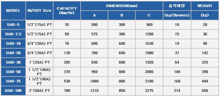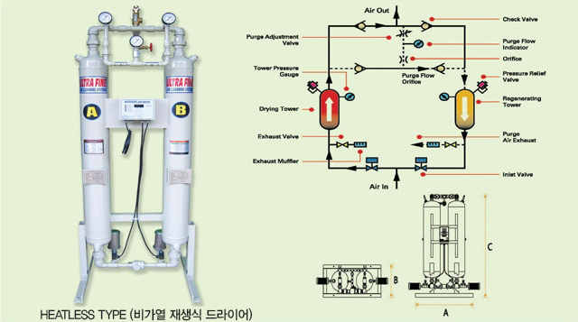 반복적인 흡착제의 자동 제습, 재생사이클에 의해서 압축공기를 최저 -73.3℃(선택사양)까지 극저온의 이슬점으로 제습을 시키며 고도의 신뢰성과 경제성이 요구되는 산업분야에 적합한 고성능 비가열 흡착식 드라이어입니다.