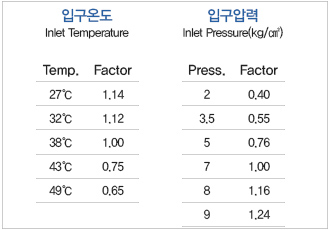 사용조건이 다를 경우, 해당 조건에 따른 처리유량 변화는 우측의 계수를 처리 유량에 곱해주면 됩니다.